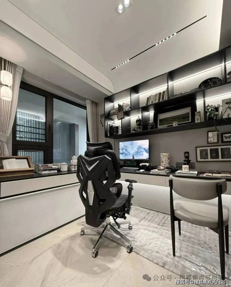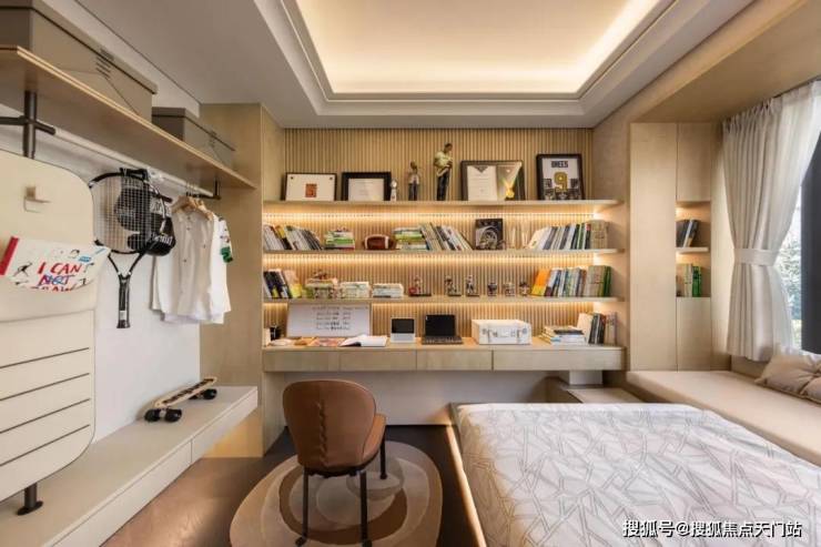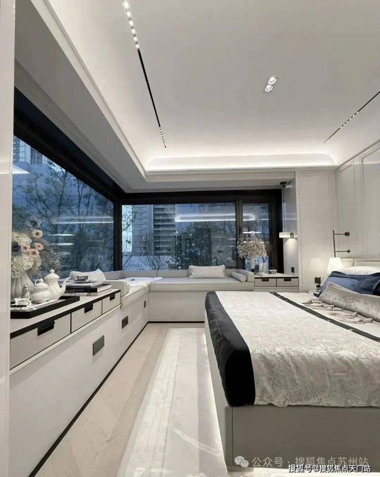 其中主卧的270°转角飘窗就有约5.7m²,通过与外立面的结合,直接做了梳妆台和储物柜,拓展了飘窗的实用性。