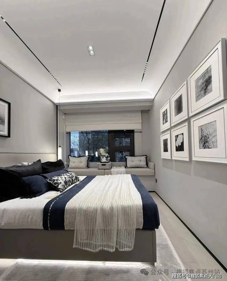 主卧转角落地窗+飘窗,也算是非常少见的了。净面宽约3.6m,不算进门的衣柜,进深大约5.7m左右。根据测算,可以放置宽约2m的床+2个床头柜(宽度约45cm/个)是可以的。