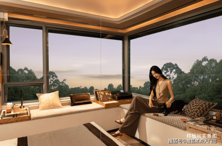 •270°无柱飘窗的主卧套设计,打造出一座“空中观景舱”,将晨昏光影、四季流转尽数收纳,极大拓展了生活的视觉与心理边界,推窗即览美景,让居家时光更具诗意。