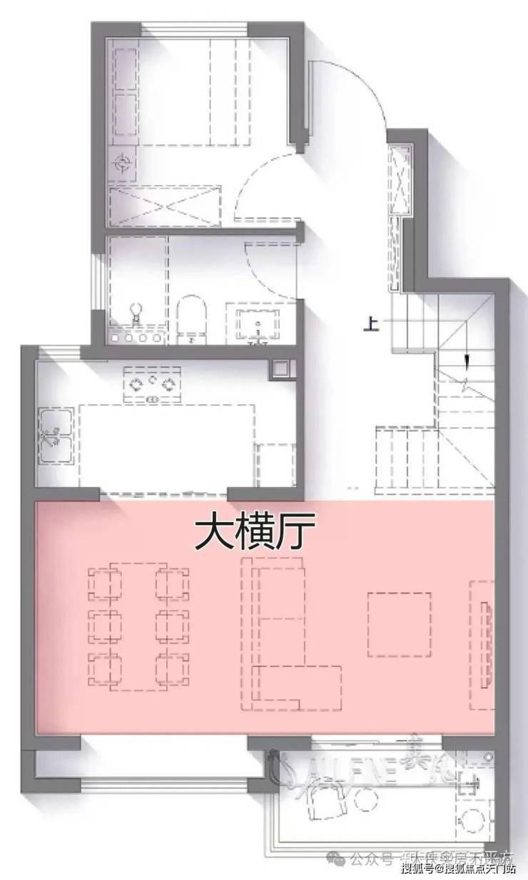 大横厅是最近几年最流行的,将客厅和餐厅二合一,横向展开。优点是空间互相借景,互相延伸,显得更大。此外,由于南面更宽,可以有更多的采光面,会让客厅更加明亮,充满阳光。