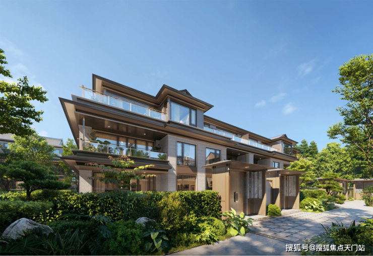 项目立面以多种新中式元素构筑东方建筑美学,横向采用大面玻璃幕墙,保障隐私的同时,尽可能的增大建筑内外场景对话。