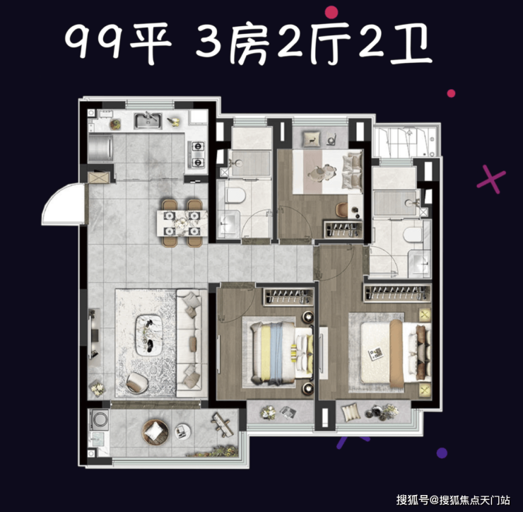 建面约99㎡的3房2厅2卫,三开间朝南+南北通透,位于楼栋的边套,主卧升级为套房设计,更适合本地客户的改善选择。