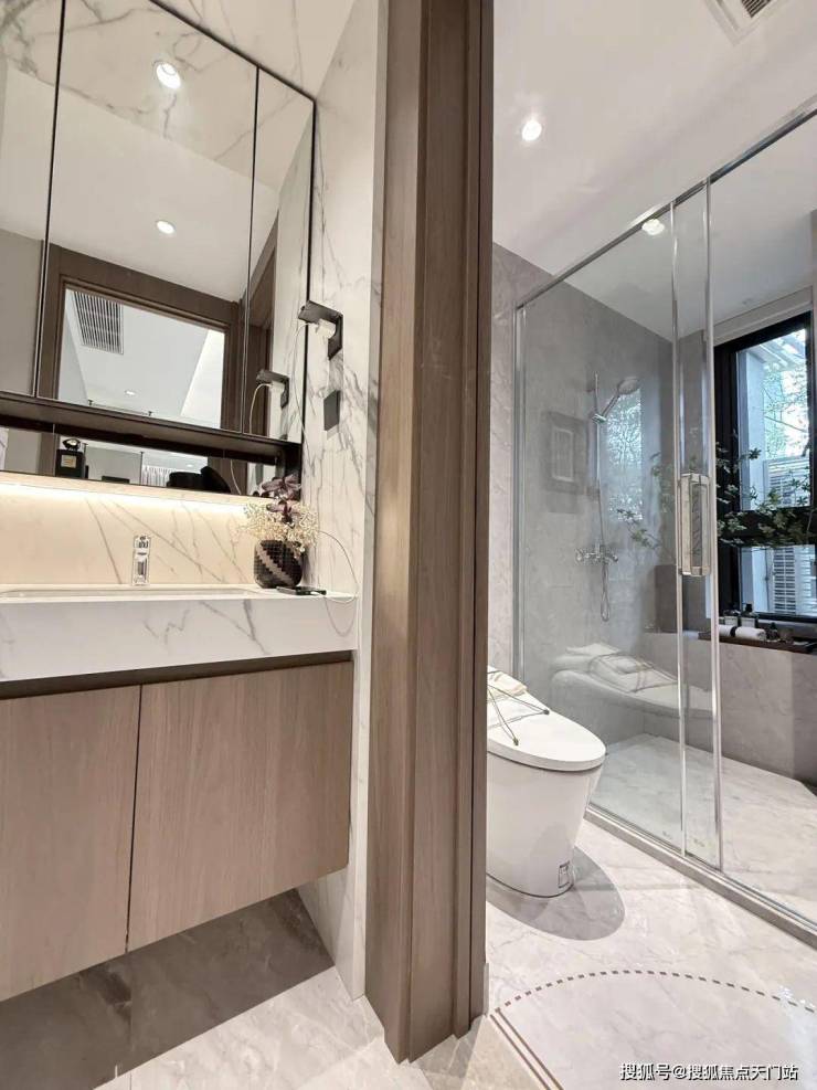 卫浴方面,采用 科勒的水龙头、台下盆、花洒、星逸智能一体化马桶, 艾美特的风暖浴霸等,更配置 恒温花洒+滑竿+顶喷等。