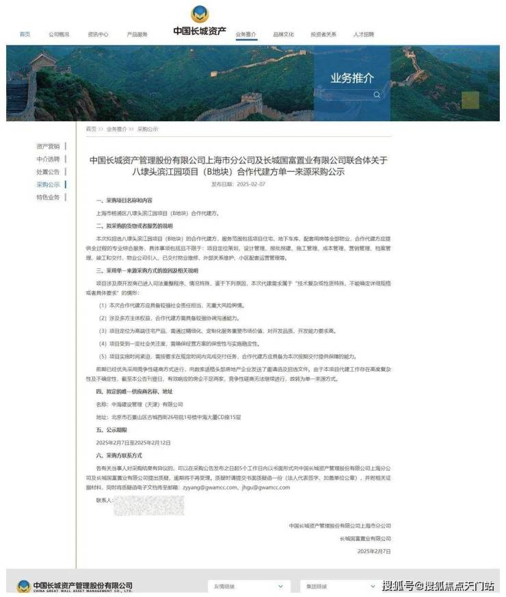 近日,作为八埭头项目重整投资人的中国长城资产管理股份有限公司上海市分公司及长城国富置业有限公司联合体在中国长城资产管理股份有限公司官网发布了关于八埭头滨江园项目(B地块)合作代建方单一来源采购公示。