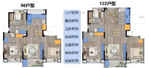 精研建筑面积约98-122m²臻品户型,全明通透大开间朝南,收纳有序空间灵动,满足人生理想。