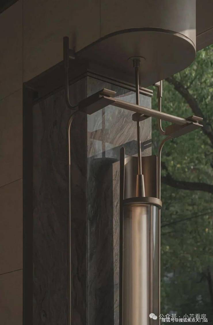 社区入口设计以“隐奢”为核心理念,摒弃传统豪宅项目的张扬符号,转而通过材质、比例与空间叙事的精准把控,传递低调中的精致感。主入口并未采用高耸的门楼或繁复的装饰,而是以米黄色石材与香槟金色金属格栅的组合,构建出克制而优雅的视觉语言。