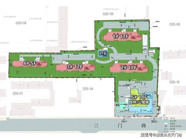根据设计方案显示 ,项目拟建三栋17层商品住宅 、一栋5层商品住宅、一栋18层公租房、自持租赁住宅及配套楼(其1-2层为菜场)和一栋1层的KT电站,并设置2层地下车库。在三门路设置机动车出入口、消防应急出入口及人行出入口。