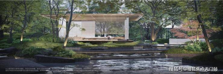 下沉式中庭花园,以⽔境、浮岛、密林,构建都市中的谧境。