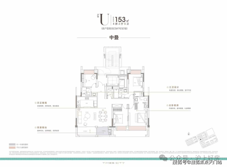 中平户型以四开间朝南的IMAX级采光面,打造出堪比市区豪宅的尺度感。4房4飘窗2阳台的设计,配合双套房布局,一共有三个套房,让每个家庭成员都享有独立私密空间。
