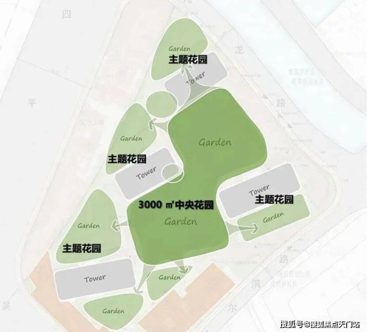 社区景观上,突破市区项目常见的「兵列树阵式」布局,通过建筑楼体的精密偏转,形成罕见的围合式社区形态。