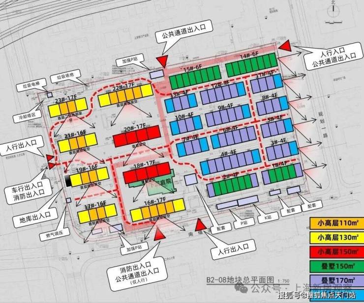 项目将拟建8幢16-17层的高层,在社区的西侧;2幢6F的洋房,以及13幢叠加,分布在了东侧。其中16、19、20、23号楼首层局部架空,18号首层全部架空。还设计了下沉庭院。