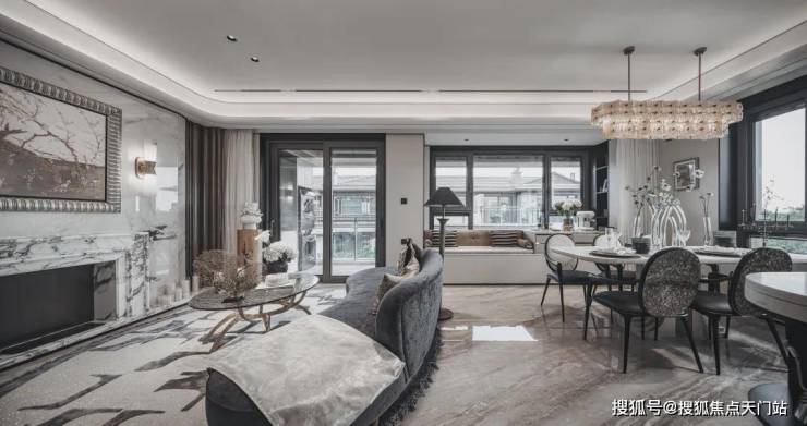 首先厨房是半开放式的岛台,让整个公区的视野更开阔,尺度更具豪宅气度。其次敞开式的厨房能让家人沟通更顺畅,温馨感提升。