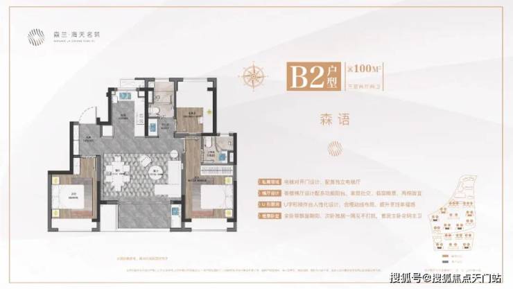 1、建面约100㎡三房两厅两卫,市场主流户型。客餐横厅设计配多功能阳台,优势在于更大采光面和更好通风效果,把过道纳入到客厅和餐厅的空间中来,使整体空间得到更好的利用。