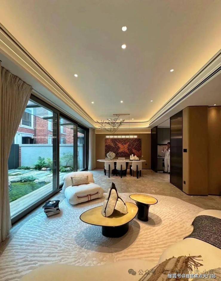 「无界空间」:客厅270度转角无柱设计,搭配落地玻璃,开阔视野将院中风景迎入日常。