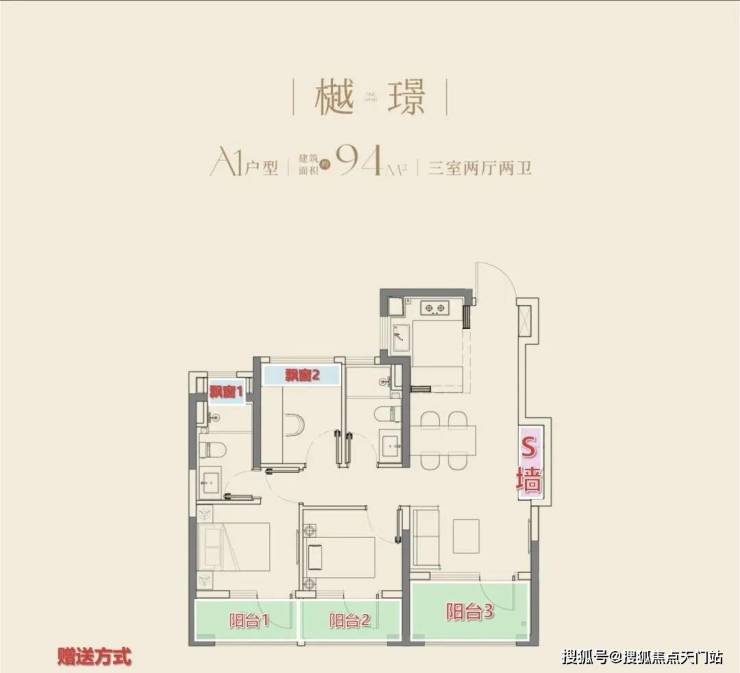 约94㎡起步户型:设计了市场上不多见的南向三阳台,凭借充足(约9%)的赠送面积,实现空间利用率最大化。