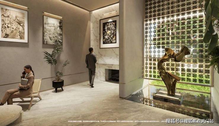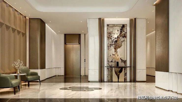 泛会所 空间打造了丰富 社交功能空间 ,更匹配高净值业主的私享需求, 米色大理石 背景墙体现高级质感,镂空屏风透出社区景观的绿意盎然。