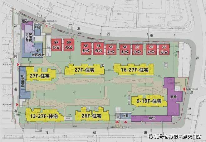 地下建设二层,局部一层,设置机动车,非机动车停车库及设备用房。基地主要人行车行出入口设置在南侧飞虹路,基地东侧许昌路设商办机动车出入口,基地西侧公共通道设一处人行出入口、一处消防应急出入口,基地北侧辽源西路设一车行入口,并兼做消防紧急出入口。