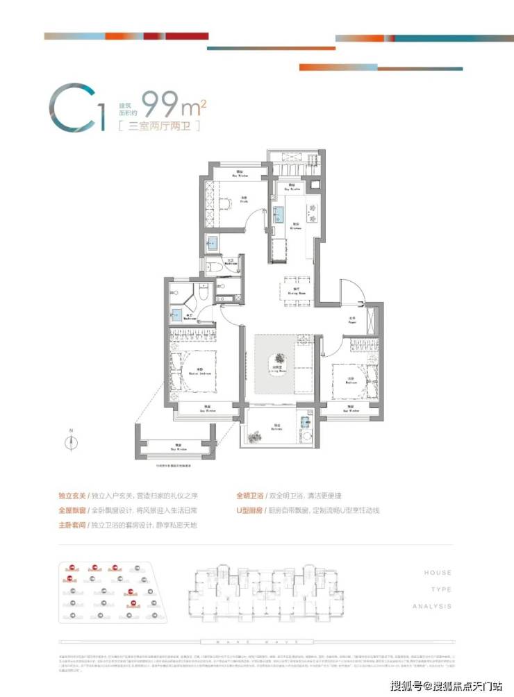 建面约99㎡三房:该户型是典型的飞机格局,很大程度上提高了使用率