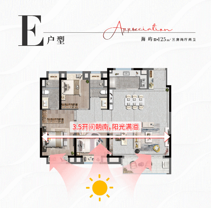 约125平为大三房,每个功能间都非常舒适,能更好满足二胎家庭/三代同堂需求。