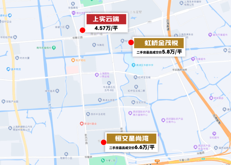 二手房方面,青浦华新的次新房已有成交数据,恒文星尚湾二手房成交价高达65746元/平,虹桥金茂悦也有58264元/平。