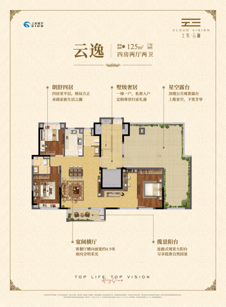 客餐厅相连,约4.9米大面宽横厅,客厅南连观景大阳台,会客区空间宽奢、大气;