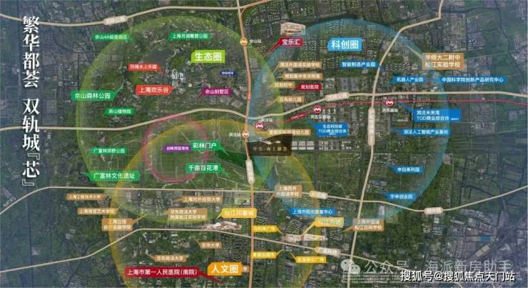 洞泾处在松江新城向北扩展的关键位置, 一头连着G60科创走廊“一廊九城” ,叠加经开区、九科绿洲、科技影都等产业平台, 一头连着松江大学城 ,七所高校集聚, “高知+科创”人群在此叠加 。