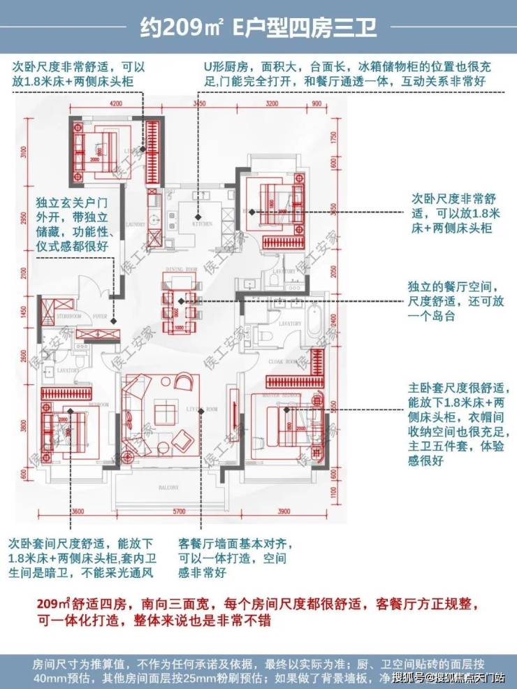 综合评价:209㎡舒适四房,南向三面宽,每个房间尺度都很舒适,客餐厅方正规整,可一体化打造,整体来说也是非常不错