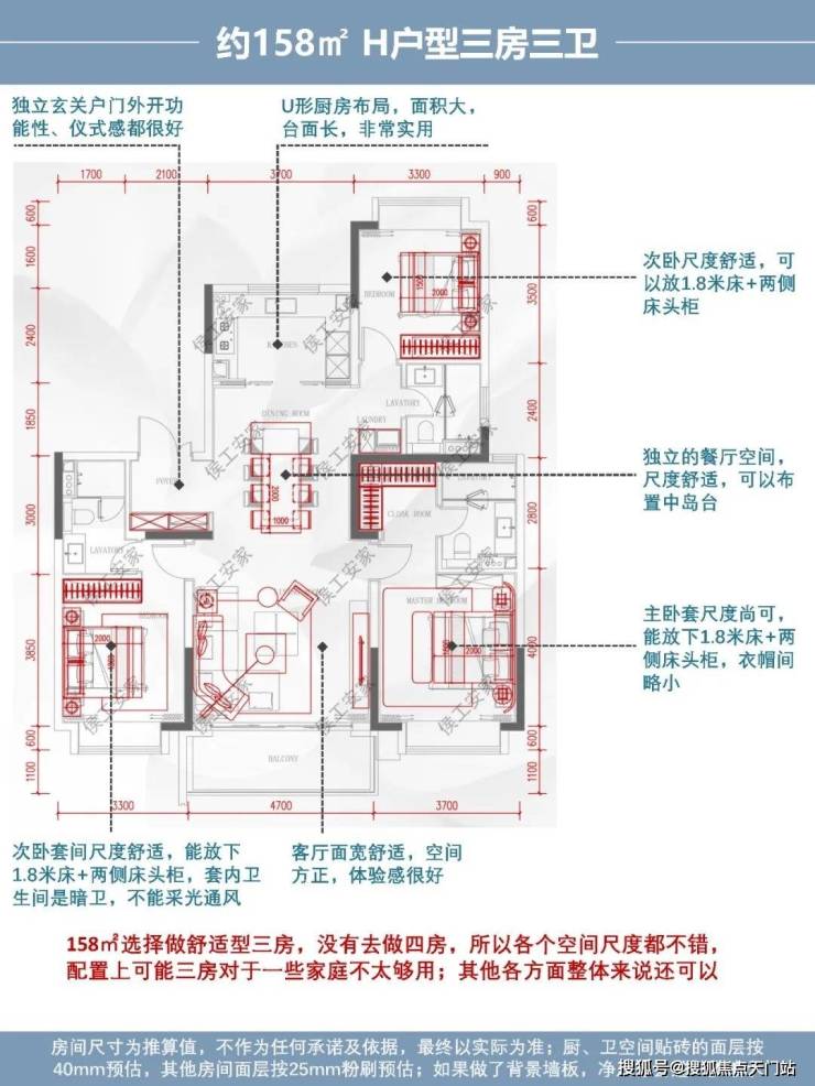 综合评价:158㎡选择做舒适型三房,没有去做四房,所以各个空间尺度都不错,配置上可能三房对于一些家庭不太够用;其他各方面整体来说还可以