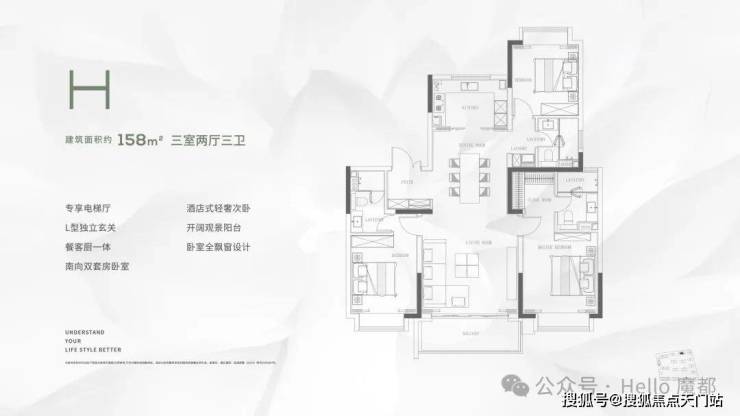 ▶H户型约158㎡ 3房2厅3卫↓