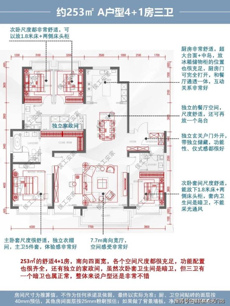 综合评价:253㎡的舒适4+1房,南向四面宽,各个空间尺度都很充足,功能配置也很齐全,还有独立的家政间,虽然次卧套卫生间是暗卫,但三卫有一个暗卫也属正常,整体来说户型还是非常不错