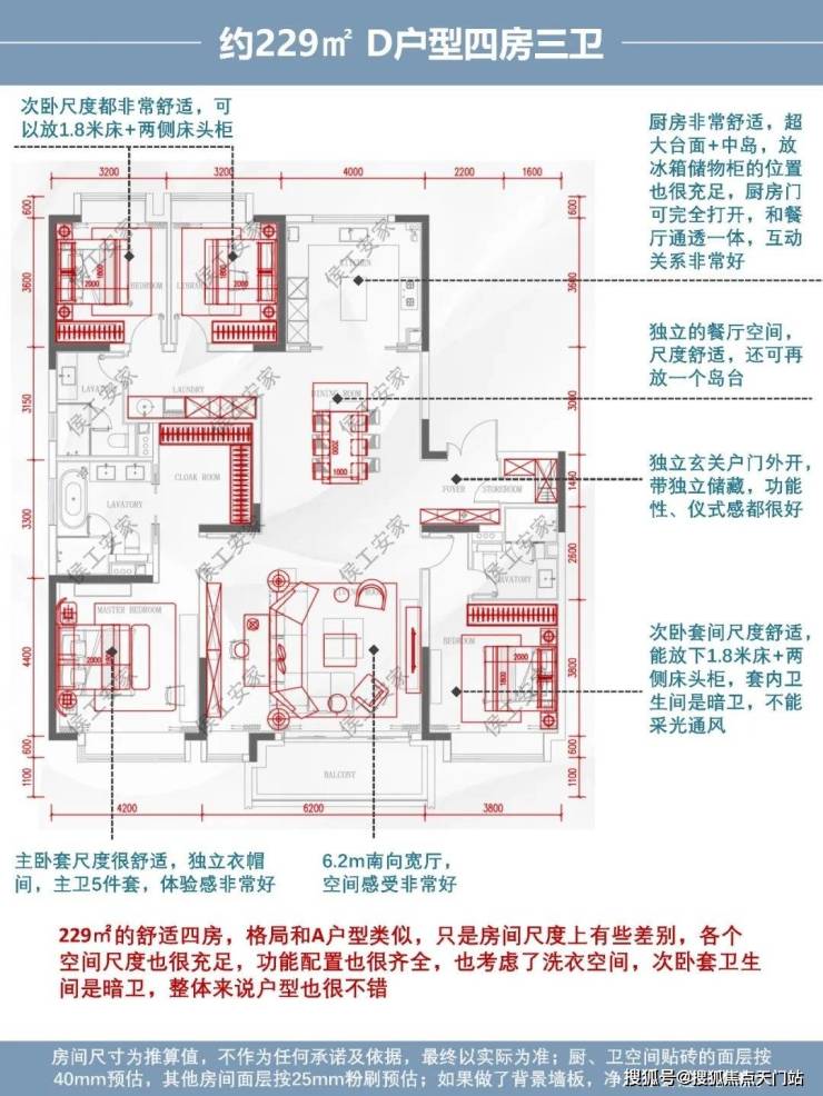 综合评价:229㎡的舒适四房,格局和A户型类似,只是房间尺度上有些差别,各个空间尺度也很充足,功能配置也很齐全,也考虑了洗衣空间,次卧套卫生间是暗卫,整体来说户型也很不错