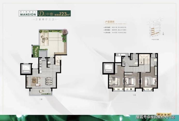 中叠建面约123平米三室三卫