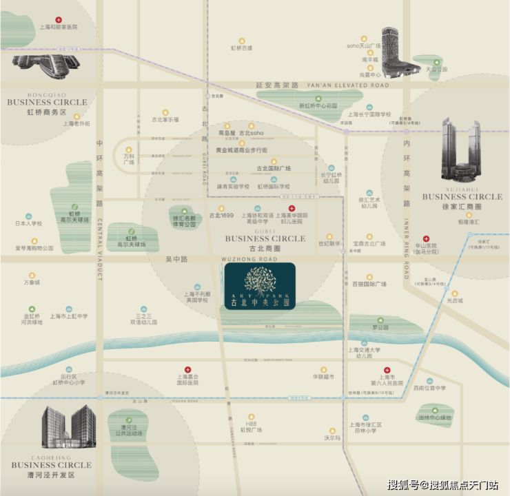 🛍️商业配套:项目往东就是徐家汇商圈,拥有对标上海国金的高端商业ITC;南面是徐汇区日月光与漕河泾产业园区;西面有万象城和爱琴海2大购物中心,以及日韩人士聚集的韩国街(虹泉路);同时,项目北面有 古北1699 、高岛屋、以及大量外籍人士非常喜欢去的黄金城道步行街及尚嘉中心和南丰城。