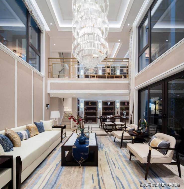 通过优化后的“L型”空间排布,实现了三面有园林环绕,前庭空间尺度非常大,一进门就是约10.2米的大横厅,气派十足,采光也做到极致,日常起居极为从容舒适。