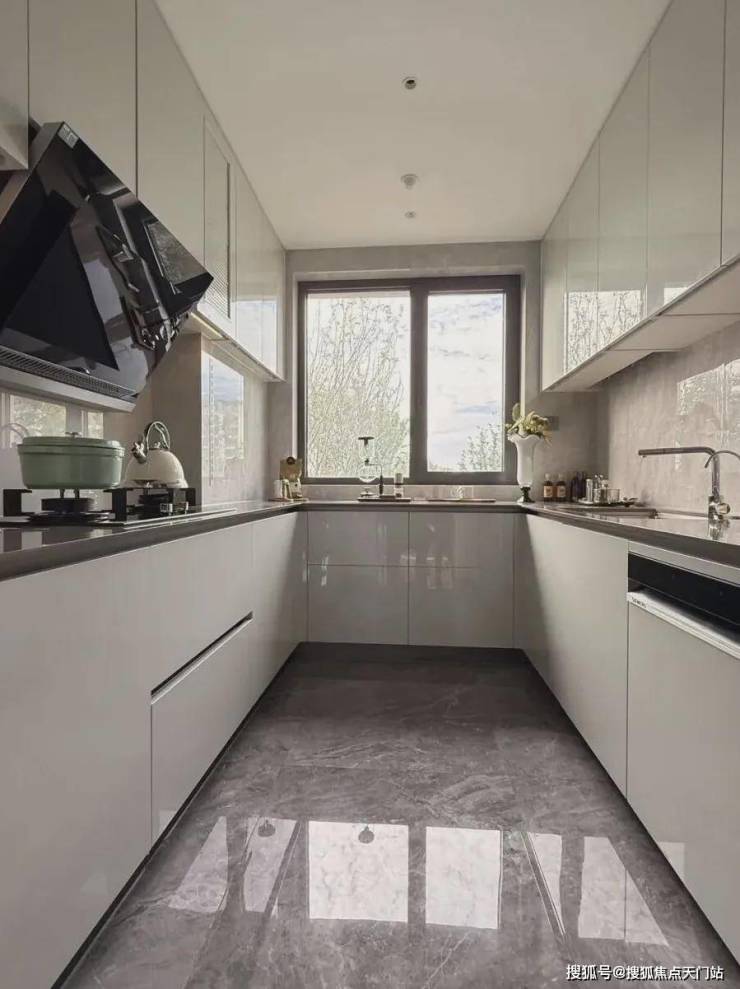 U型厨房:厨房采用U型布局,并巧妙融入飘窗元素,拓宽视野同时增添休闲氛围。