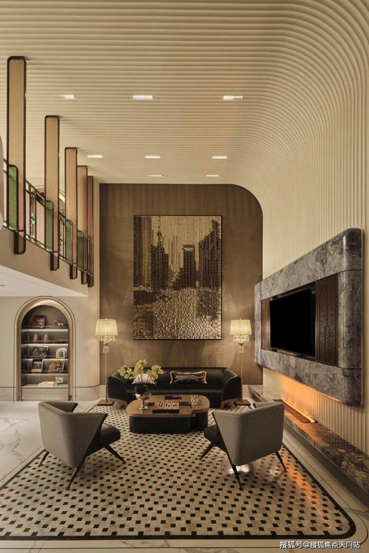 地下层是整个空间气场的焦距点,挺阔的构架式设计,顶面有序的木质分割中,波纹造型将天花与立面持续延伸,有效的拓展了空间高度。