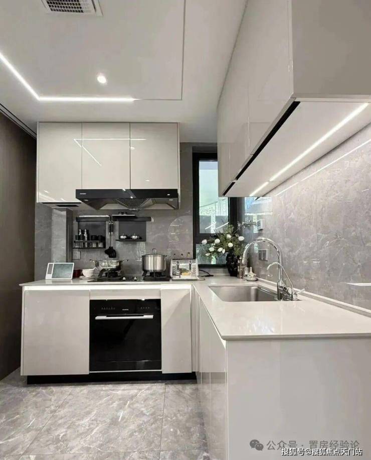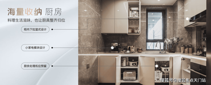 橱柜收纳系统:特别预置洗碗机点位、柜内下拉篮式设计、不锈钢挡油板、柜下操作灯、烹饪全流程功能动线一体化设计;
