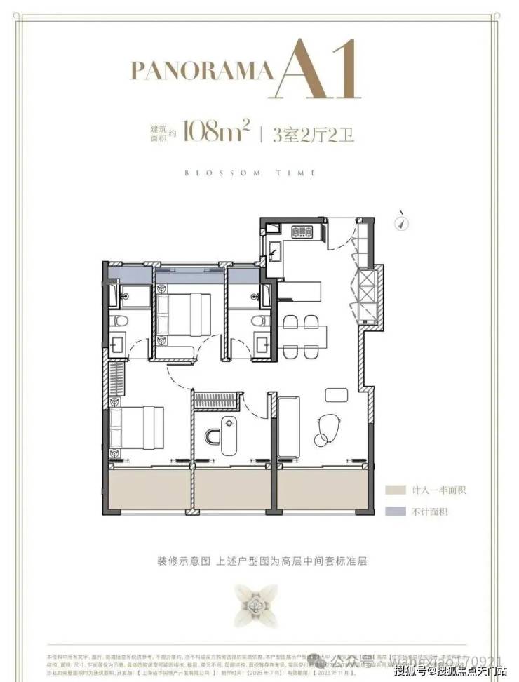 建面约108㎡3房,三阳台面积达约13㎡(赠送一半),飘窗赠送约3.3㎡,室内使用面积达约94.5㎡,实得率高达约87%,总赠送面积比常规次卧都大。