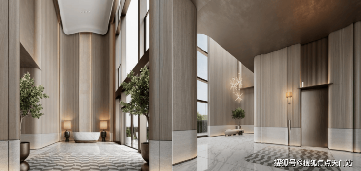 底部以石材和金属结合的曲线异形巨柱抬高建筑体量,构筑了廊柱与动态景观空间,既满足了尊贵的入户大堂需求,又释放了底层空间的潜力,进一步提升了低层住宅的采光效果和视野范围,从而营造出更为宜人的居住环境。