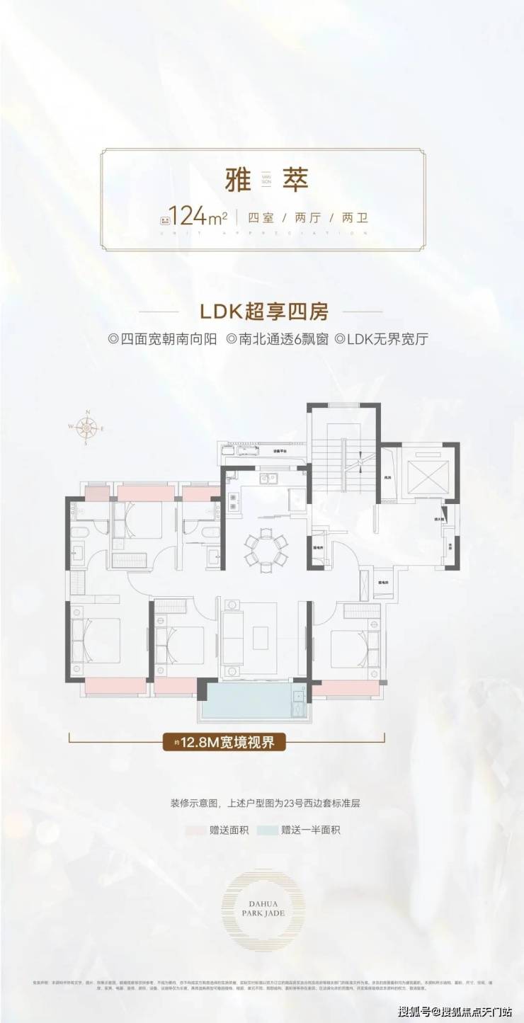 建面约124㎡四房是四开间朝南布局,电梯厅看着做了额外的隔档,可以形成类似私家电梯厅的额外利用空间。