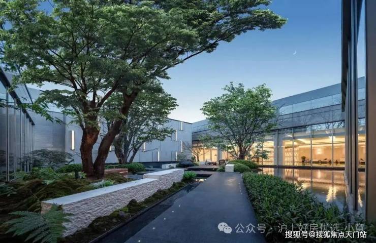向外连接的是 下沉庭院的“古树浮桥” ,水镜、古树、桥廊与围合立面共同形成一个“可停留”的自然剧场——不是装饰,而是鼓励你去使用的第三空间。