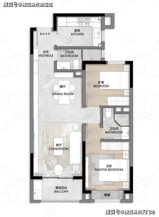 第二个亮点,是 动静分离+客餐厅一体化设计,功能区和休息区互不干扰,客餐厅、厨房等公共活动区集中在一侧,卧室等休息区全部一侧,保证了私密性!