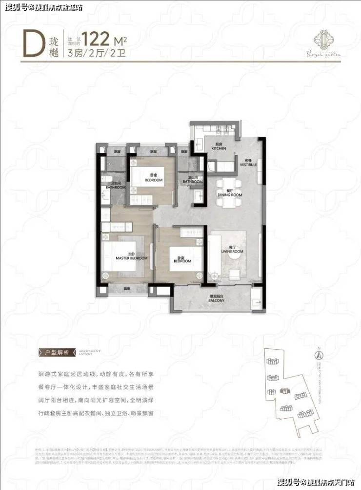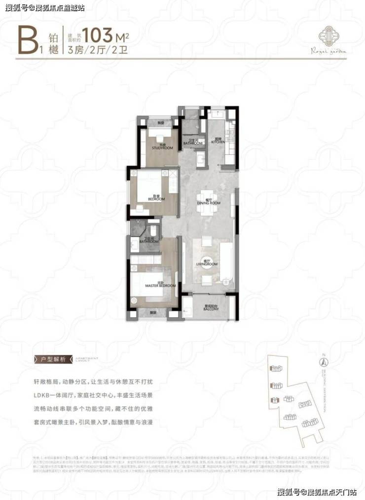 104㎡3户型特点:该户型多为楼栋的 东边套,是一个观景户型。客厅连接270°阳台,视野出众。双卧朝南,阳光满溢。从次卫布局看,如果家庭人口较少,该户型还能做成双套卧。