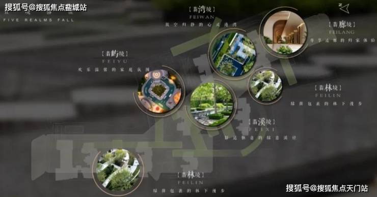 规划了 “翡色五境”五大空间氛围,匠造融入时光、人文海派、自然与艺术、家庭与邻里的 “四轴、三园、五区、一所”四大功能空间。