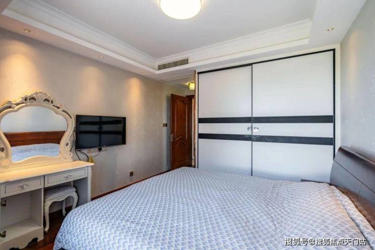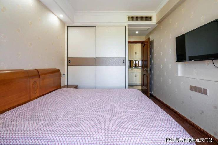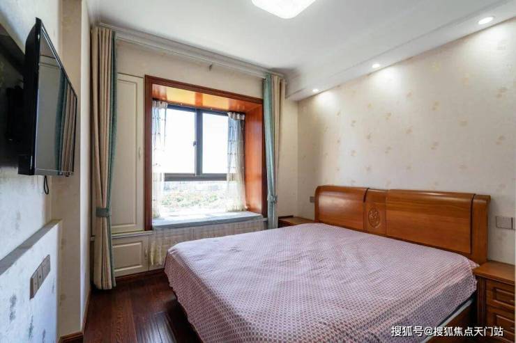 卧室复古床具精致,暖光洒落。窗边躺椅静候,傍晚窝在那儿,看墙上电视,晚风从纱窗溜进,惬意漫上心头。
