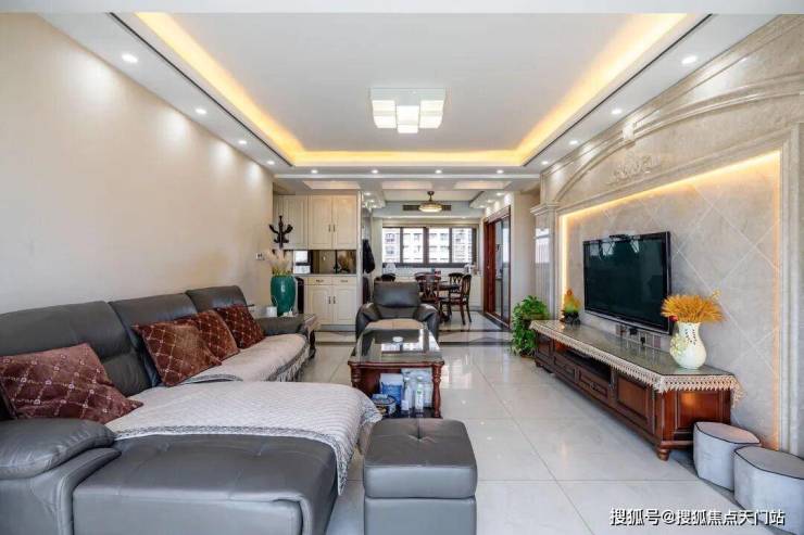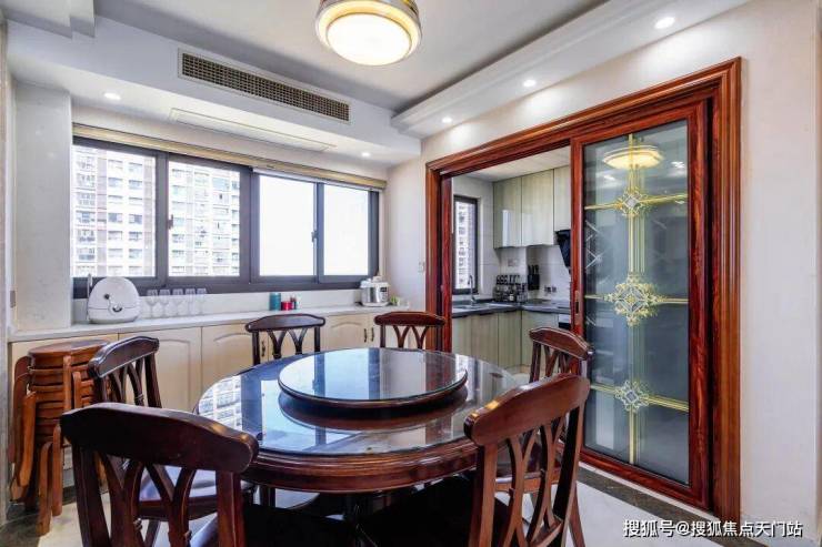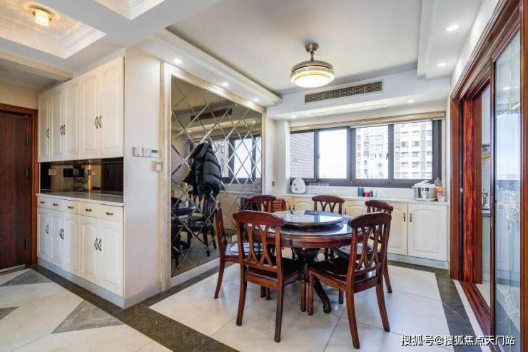 餐厅与客厅衔接自然,镜面墙、精致顶灯点亮空间。周末,家人围坐圆桌吃饭,客厅沙发上的笑语也能传来,温馨满溢。