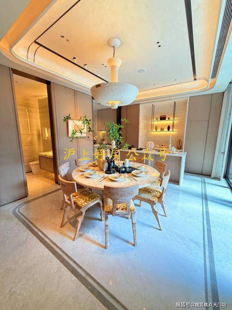 餐厅的设计巧妙融合了老上海的经典元素,圆形餐桌和橘色皮质餐椅在色彩上既现代又充满活力,顶部的水晶吊灯造型灵感来自上海市花“玉兰花”,既增添了空间的华丽感,又巧妙地融入了上海的地域特色。
