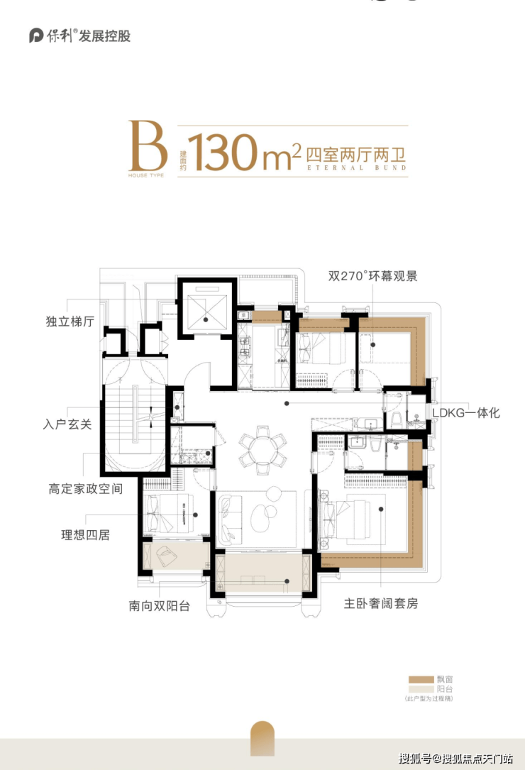 保利外滩曜建面约130㎡的实际使用率做到了约94%,双阳台+双约270°视野+一梯一户独立电梯厅+多飘窗。