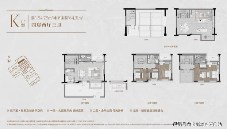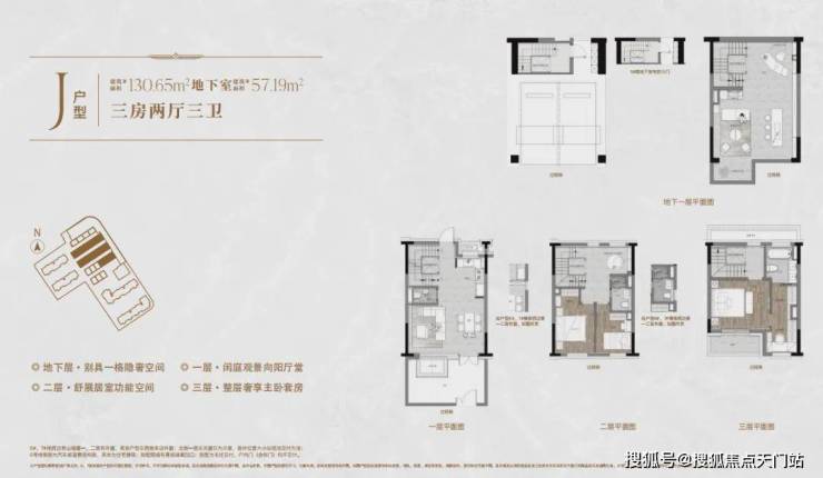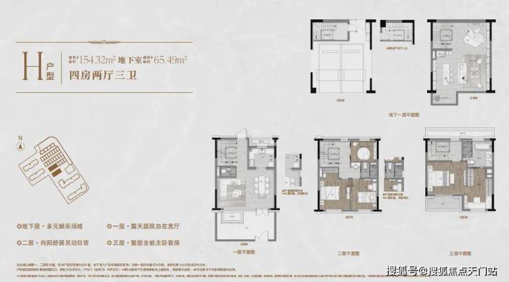 一楼和地下室主社交和志趣,二楼是子女的房间,三楼是主人休憩区。