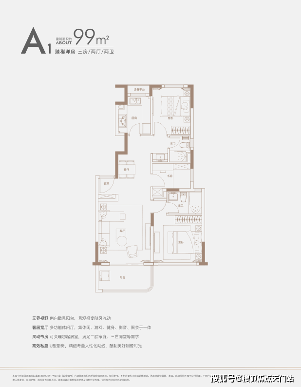 建面约140㎡四房:三开间朝南户型,南北通透,采光条件优质,客厅明亮宽敞,彰显大气布局。